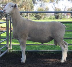 Outstanding young August drop sire purchased by SuperWhite group with a share retained by Detpa Grove. Part of the winning Tatiara lamb production class pairs at Adelaide Royal 2005, this young sire has exceptional length and carcase with a very smooth shoulder set. Great neck extension and presence adds class to this young sire and with lambs already on the ground at Detpa Grove, this sire with a very high and well balanced Carcase + index has plenty to offer any breeding program.