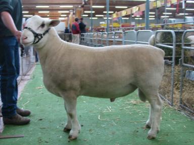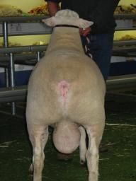 Very solid, well muscled ram with great conformation and bone. A high Suffolk percentage (83.7%) white ram that that gained a lot of praise from the judge at Adelaide Royal for his exceptional hindquarter muscle pattern and shape. A very correct and smooth ram with plenty to offer. Lambplan EBV's - 1/09/03