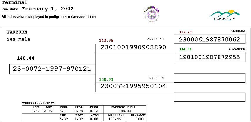 121 Very good sire that has been used with great success in Warburn stud. Has good growth figures, a very solid carcase with good conformation. Still producing top sheep at Warburn, this ram has also been successfully used by a number of other studs. Lambplan EBV's - March 2002 run